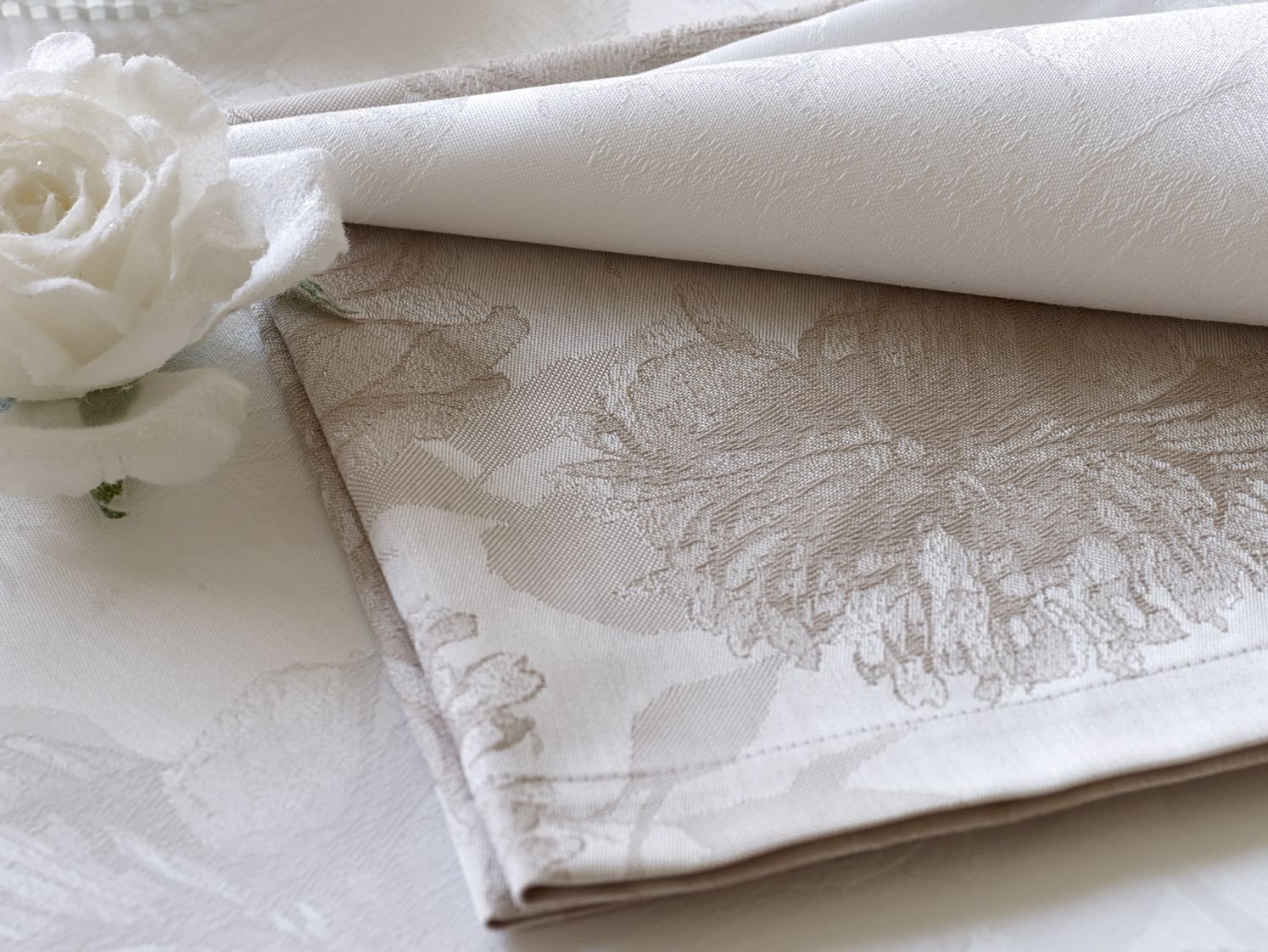 - В коллекции салфетки габаритом: 50/50 см, наперон (дорожка для стола): 50/140, 50/160 см. Два тона.