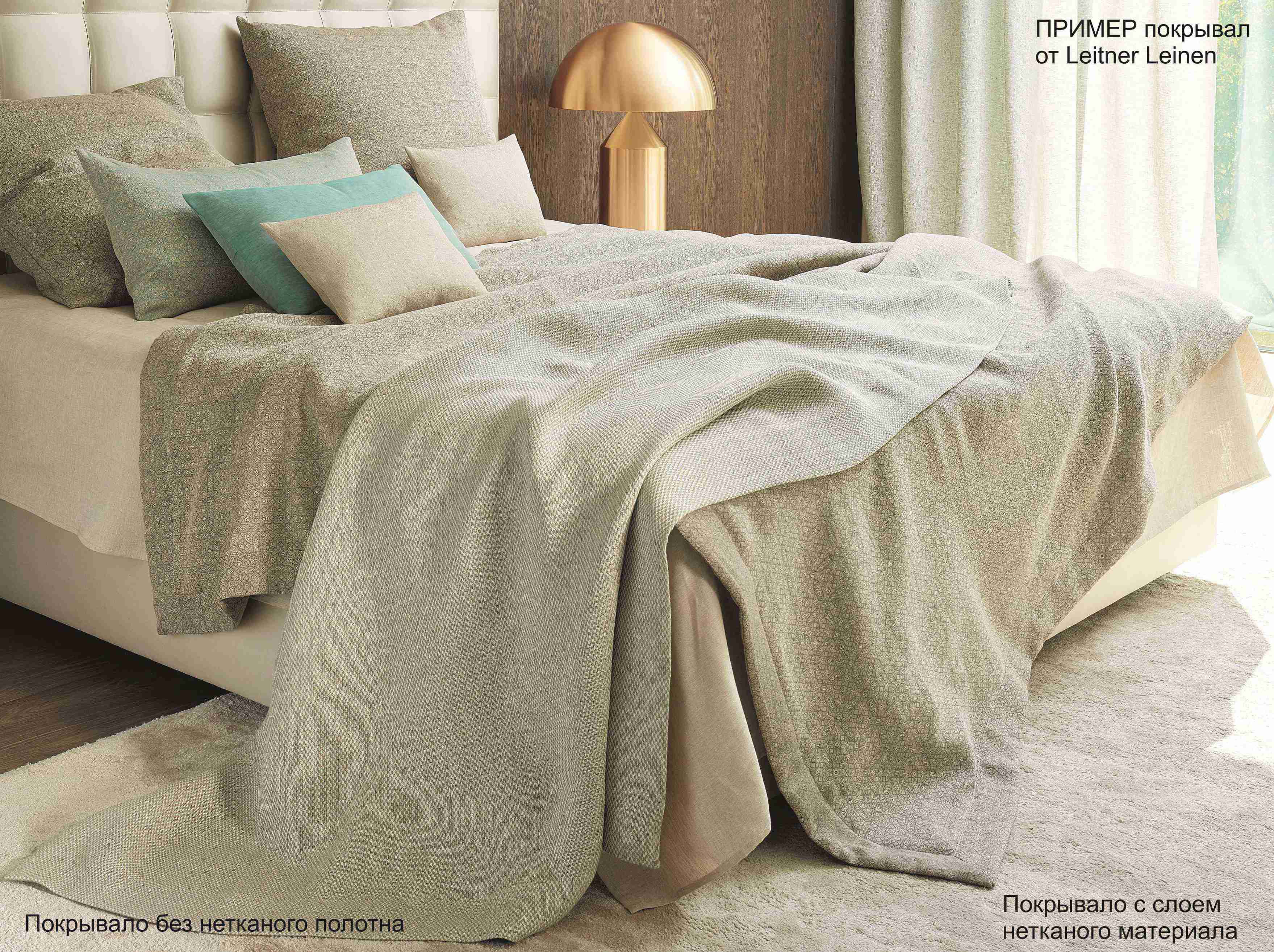 - При изготовлении без подклада (прослойки) элегантное постельное белье Leitner стандартно изготавливается с кантом шириной 10 см и угловыми швами. По запросу возможно изготовление с простой кромкой конверта, т.е. без канта (широкой отсрочкой), по той же цене. Покрывала без нетканого материала изготовлены с учетом припуска на среднюю величину усадки.
