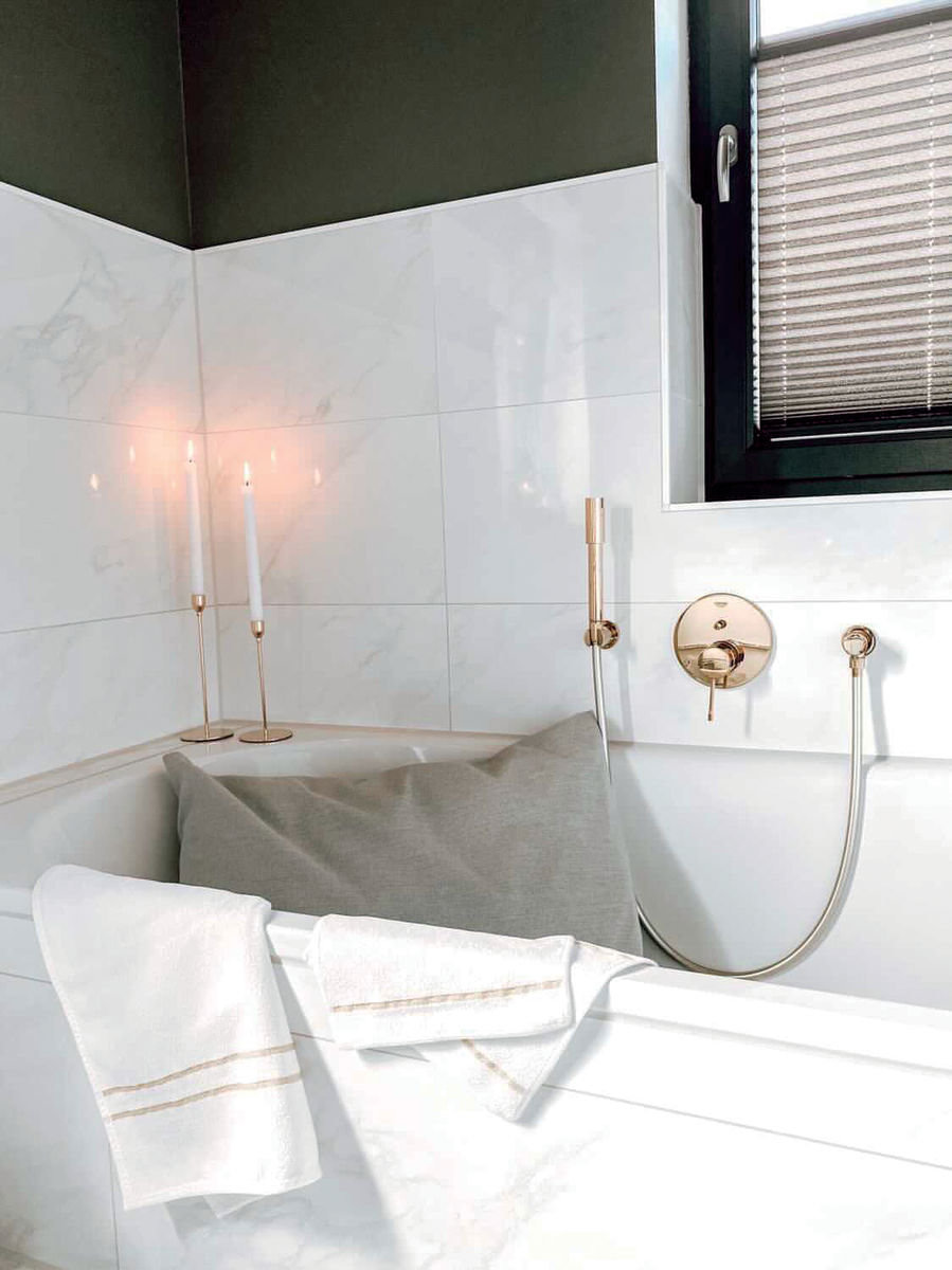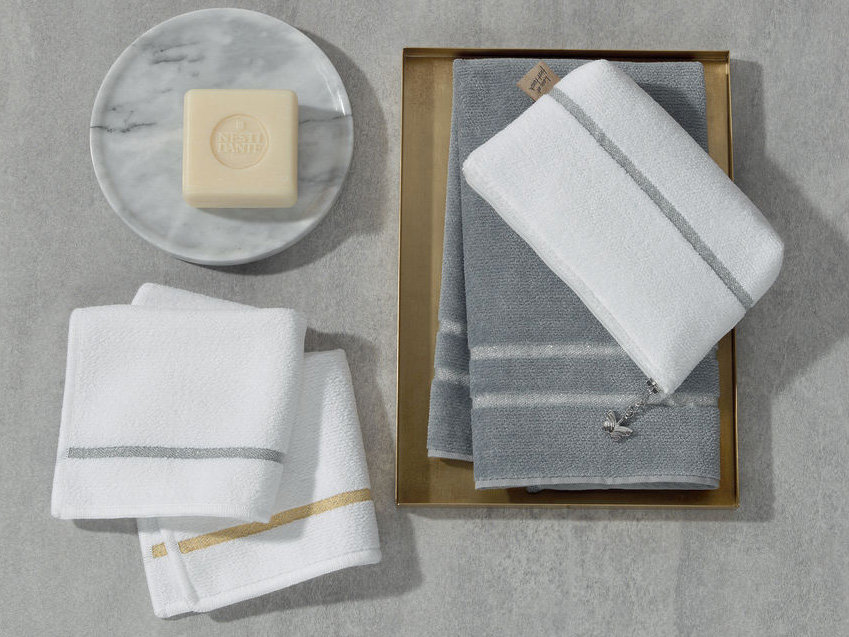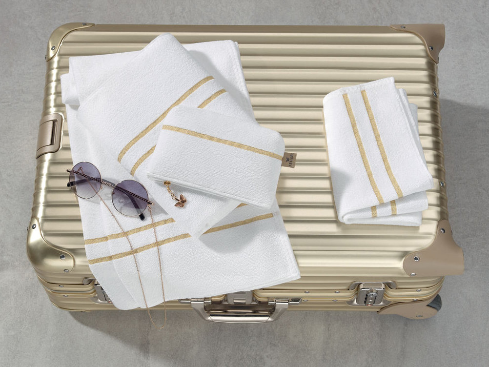 - Белый фон полотенца с узкими полосками в тоне золота