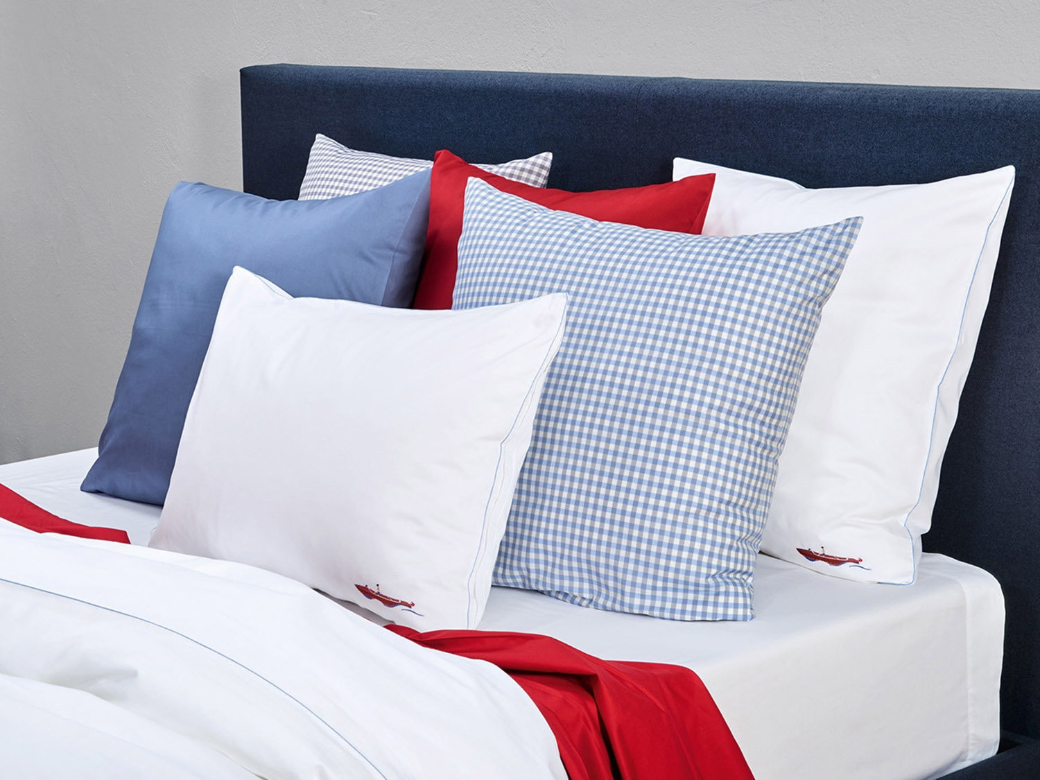 Атласное постельное белье SUMMER FUN привносит легкую спортивную атмосферу праздника. Скоростной катер украшает наволочку в правом нижнем углу. Пододеяльник для пухового одеяла украшен большим катером, тянущим воднолыжника. Разноцветная ручная вышивка сочетается с тонким угловым кантом синего цвета. Кант обрамляет по периметру всю наволочку и пододеяльник.